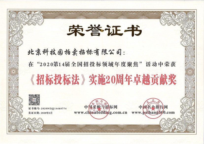 2020第14屆全國招投標(biāo)領(lǐng)域年度聚焦“《招標(biāo)投標(biāo)法》實施20周年卓越貢獻(xiàn)獎”(2020.5)