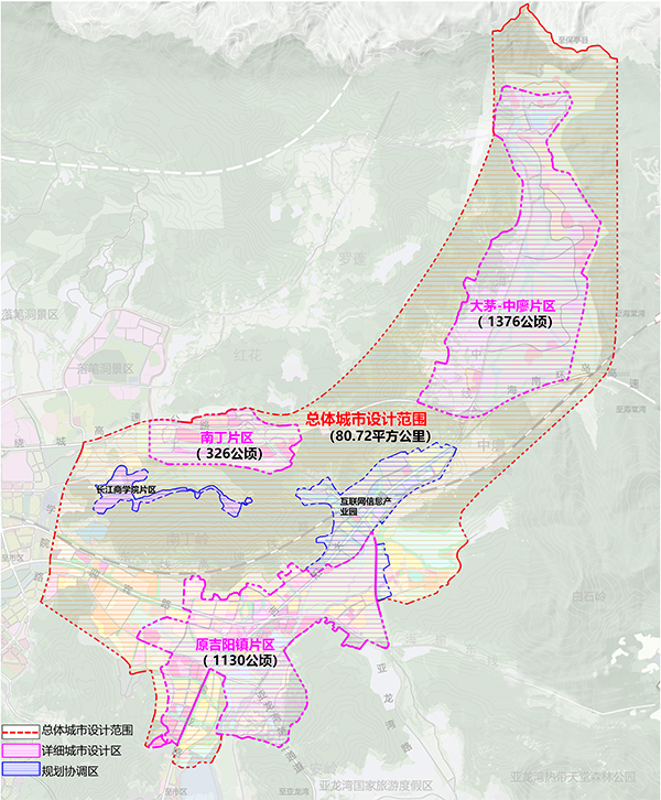 詳細(xì)城市設(shè)計(jì)包括3個(gè)片區(qū),總面積約2832公頃。其中,原吉陽鎮(zhèn)片區(qū)面積約1130公頃,南丁片區(qū)約326公頃,大茅-中廖片區(qū)約1376公頃(詳見規(guī)劃范圍示意圖)。