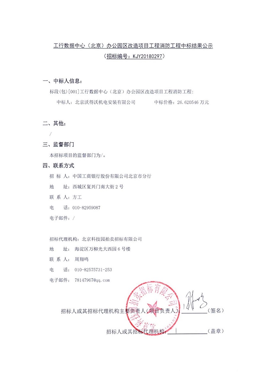 工行數(shù)據(jù)中心(北京)辦公園區(qū)改造項目工程消防工程中標(biāo)結(jié)果公示