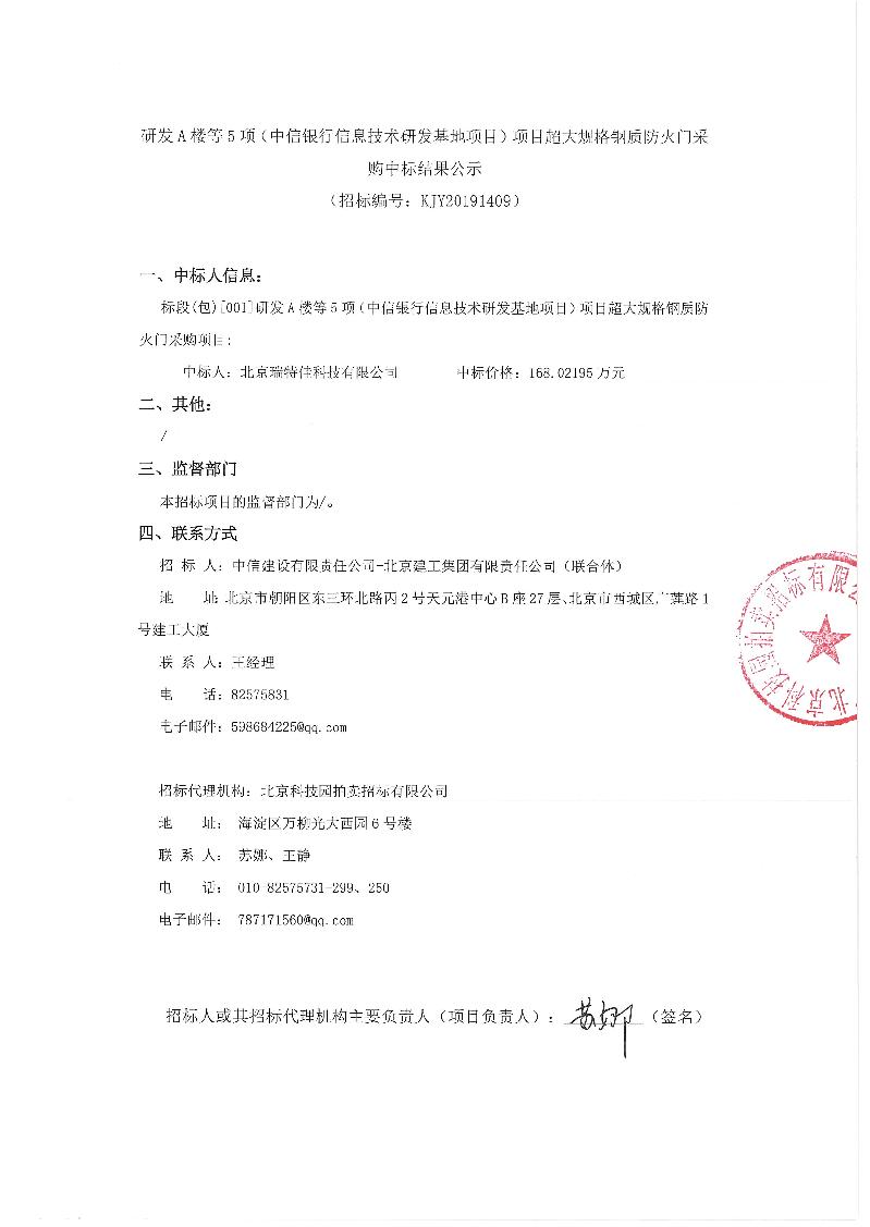 研發(fā)A樓等5項(xiàng)(中信銀行信息技術(shù)研發(fā)基地項(xiàng)目)超大規(guī)格鋼質(zhì)防火門采購中標(biāo)結(jié)果公示